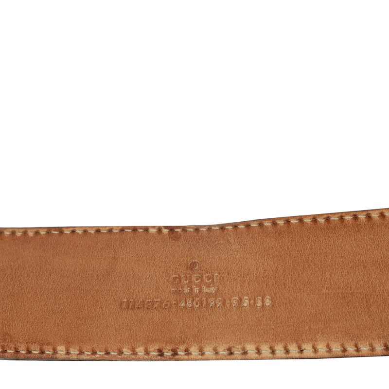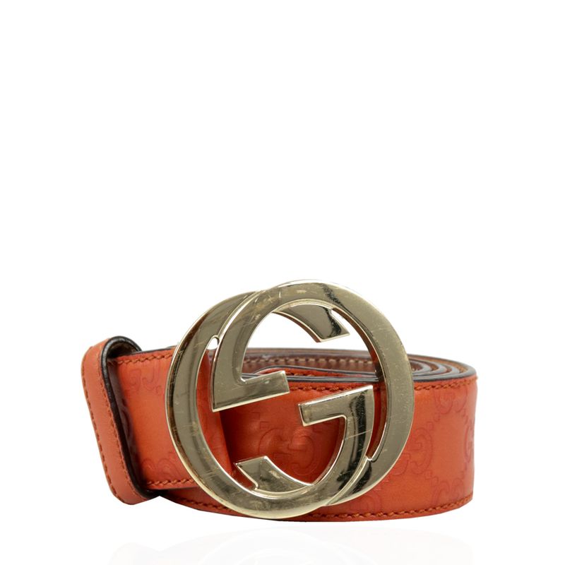 Cinto da marca Gucci, tamanho 95, confeccionado em couro laranja com logo da marca em baixo relevo e fivela em metal dourado. Encontra-se em ótimo estado de conservação, com leves arranhões na fivela.