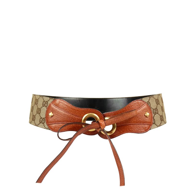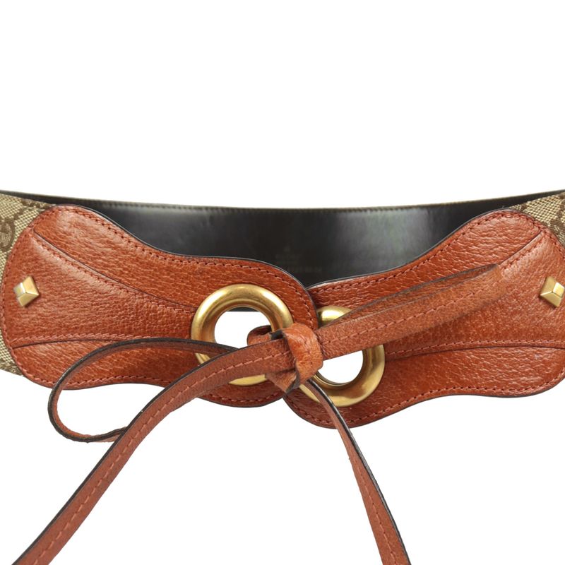 Cinto da marca Gucci, tamanho 85, confeccionado em couro caramelo e jacquard. O cinto conta com detalhes em metal dourado e fecho por meio de amarração. Encontra-se em excelente estado de conservação, sem sinais de uso.