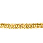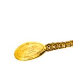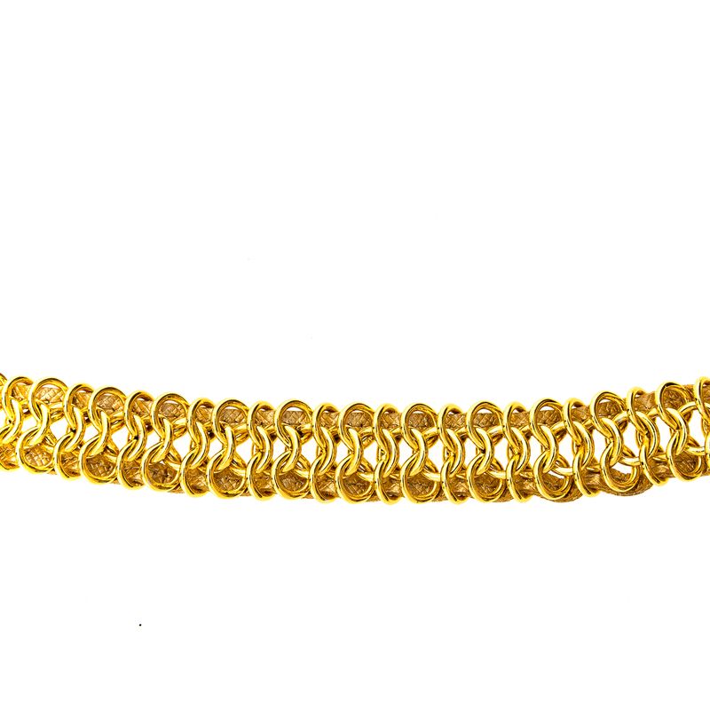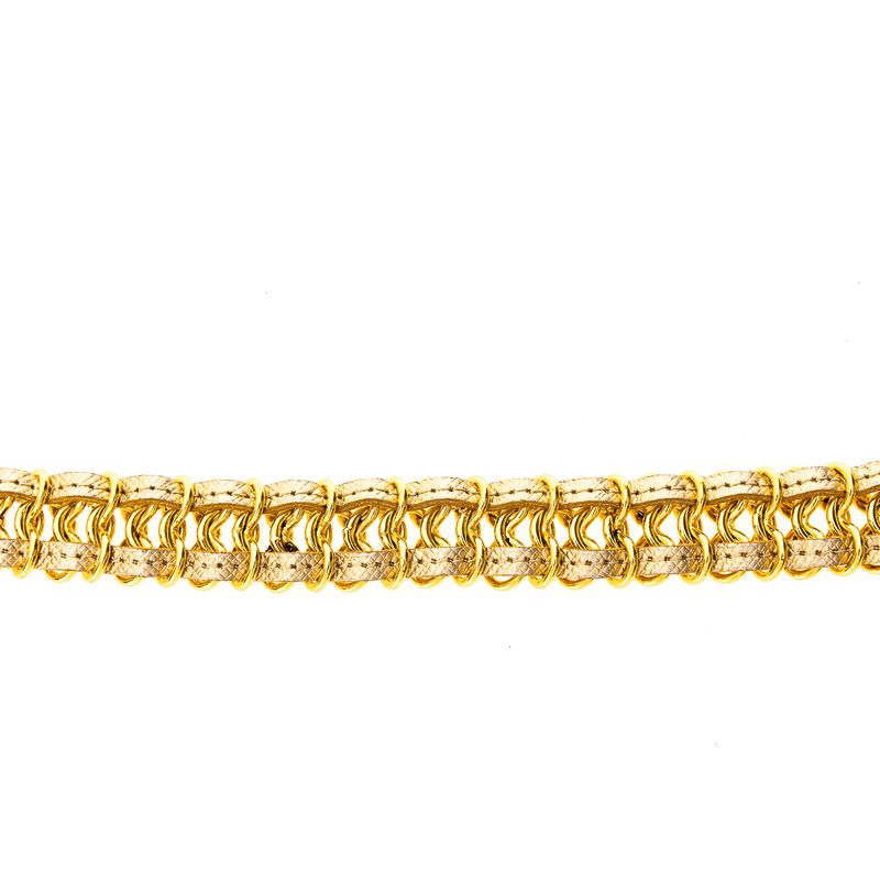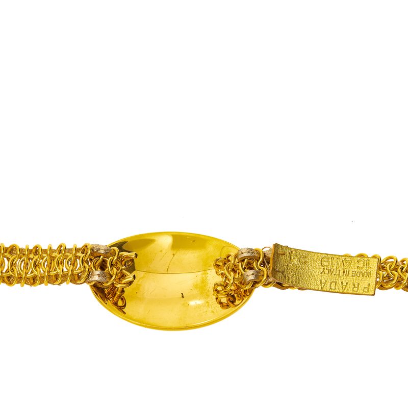 Cinto da marca Prada. Confeccionado em metal dourado, com fitas de couro entrelaçado, fivela dourado com nome da marca. A peça se encontra em ótimo estado, com levíssimas marcas de uso, fivela com riscos.