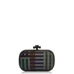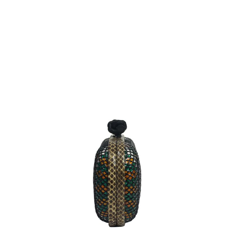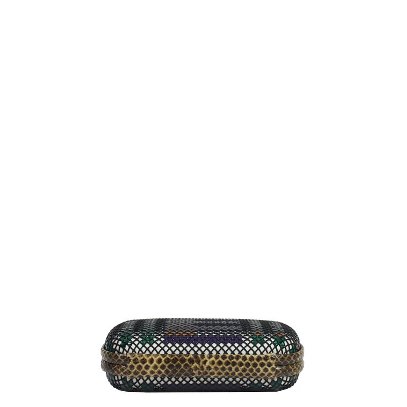 Clutch da marca Bottega Veneta, tamanho 18 cm C x 11 cm A, confeccionada em metal preto com detalhes coloridos e python. Encontra-se em excelente estado de conservação, sem marcas de uso.