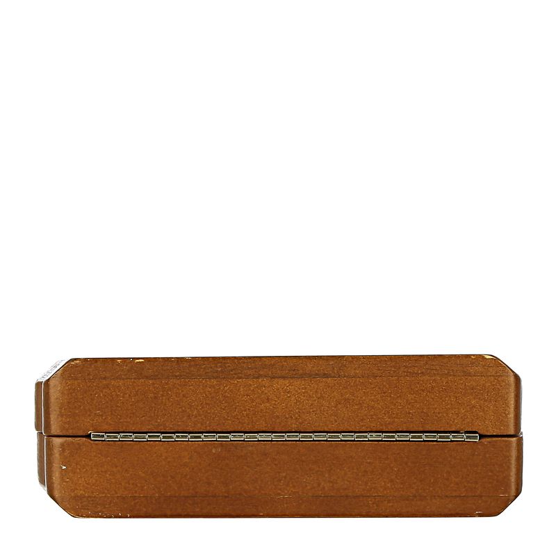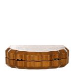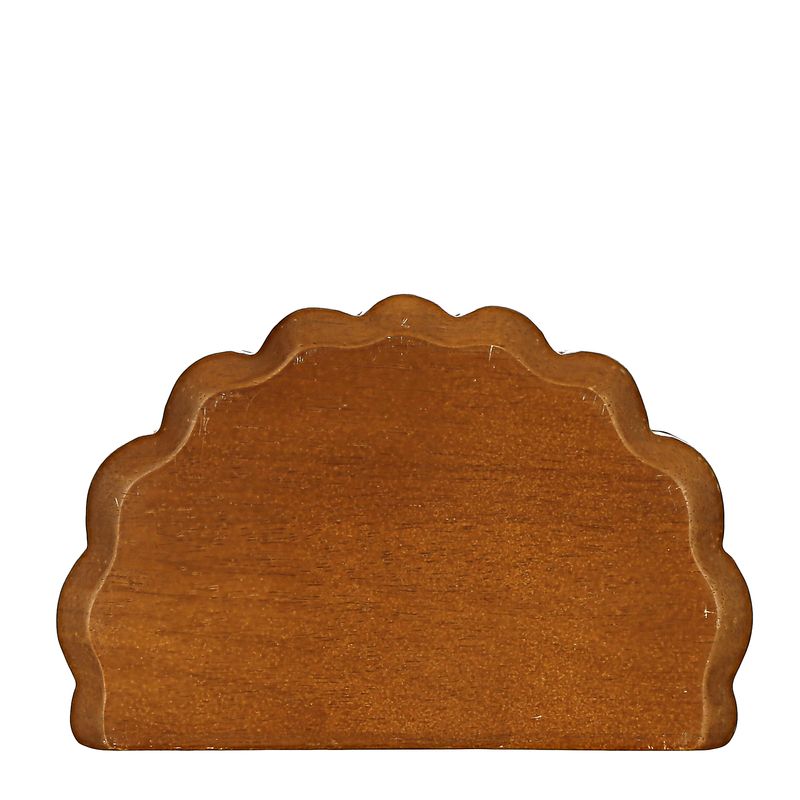 Clutch confeccionada em madeira, possui um compartimento interno, formato ondulado e fecho por imã. Não possui alça. A peça apresenta marcas de uso e desgastes.