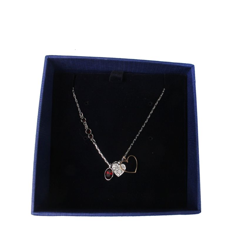 Colar da marca Swarovski confeccionada em metal prateado com três pingentes: um em cristal vermelho oval; em formato de coração cravejado em cristais; coração em metal dourado vazado.Encontra-se em excelente estado de conservação, nunca usado.