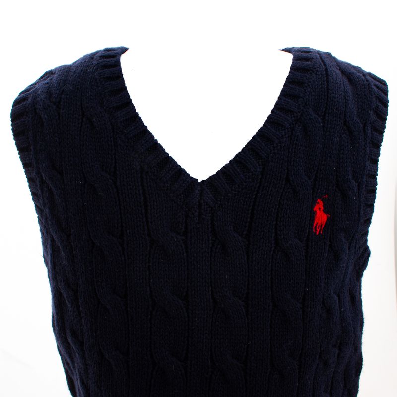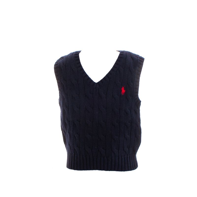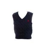 Colete da marca Ralph Lauren Kids. Confeccionado em tricô azul marinho, gola v e manga curta. A peça se encontra em ótimo estado, com leves marcas de uso.