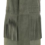 Colete da marca TalieNK. Confeccionado em couro na cor cinza. O colete possui comprimento longo, toque de camurça e detalhe de franjas na altura da cintura. Não possui fecho. A peça se encontra em estado satisfatório, com leves marcas de uso aparentes.