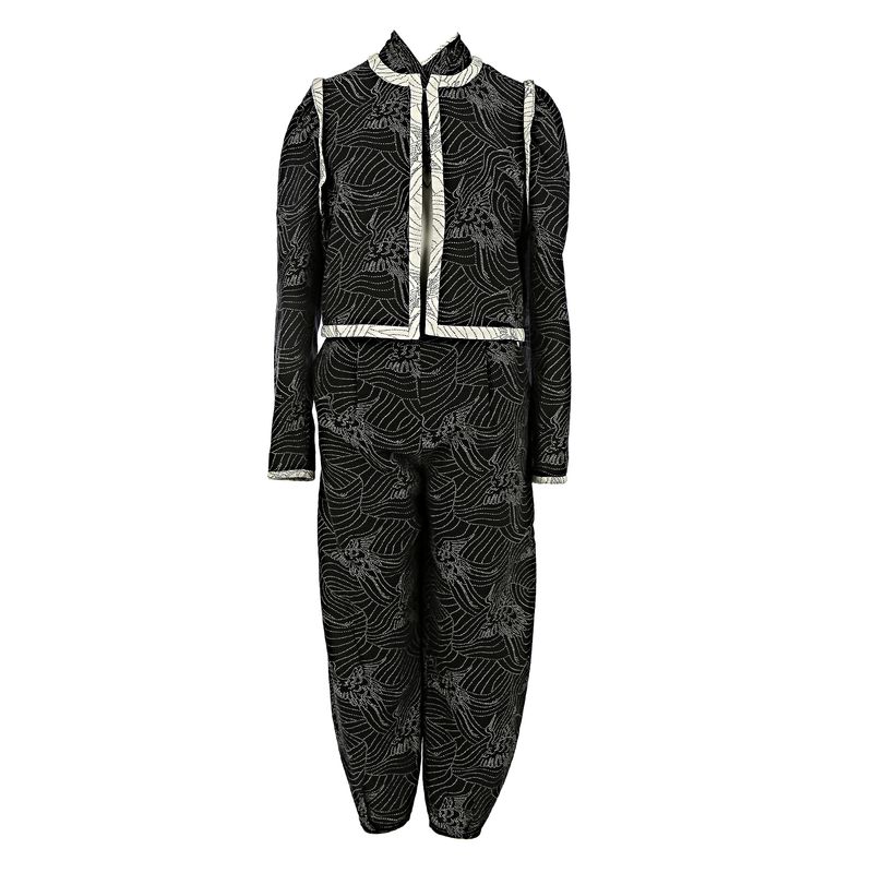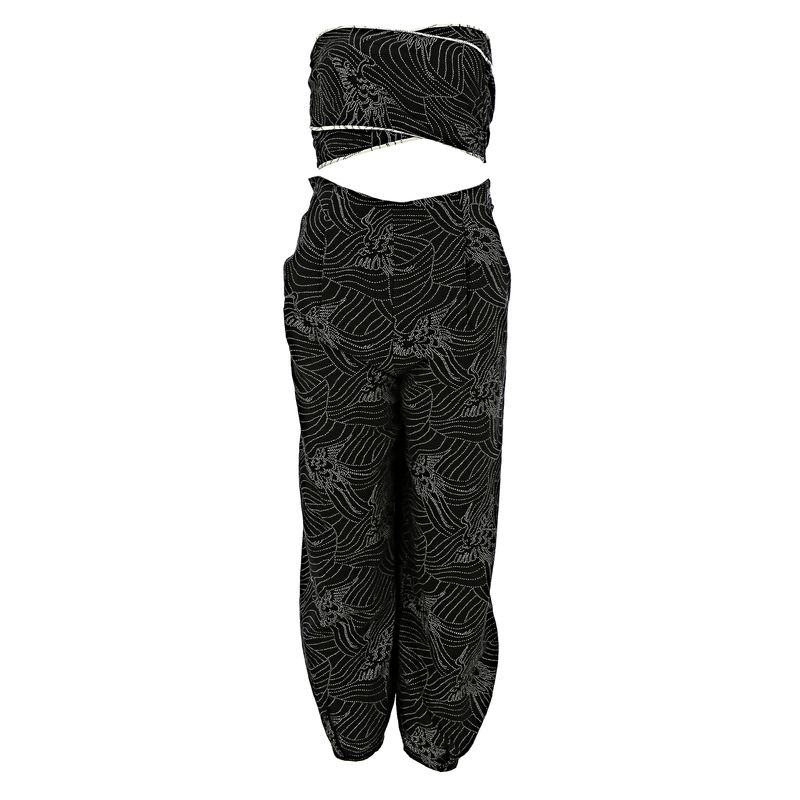 Conjunto da marca Cris Barros. Composto por macacão tomara que caia estampado com fecho em amarração no busto e zíper na lateral e Casaco na mesma estampa preto e branco aberto com um fecho de encaixe na parte da frente. As peças se encontram em excelente estado, muito bem conservadas.