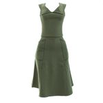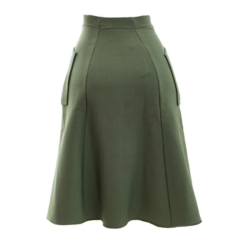 Conjunto Lolitta, composto por blusa e saia. Confeccionados em acetato verde, a blusa possui tamanho P, enquanto a saia mídi é tamanho M. A blusa conta com fecho traseiro por zíper e a saia possui dois bolsos laterais, sem fecho. A peça se encontra em ótimo estado, com levíssimas marcas de uso.