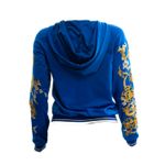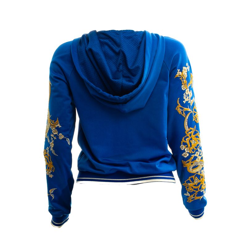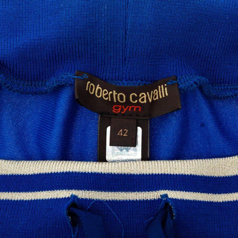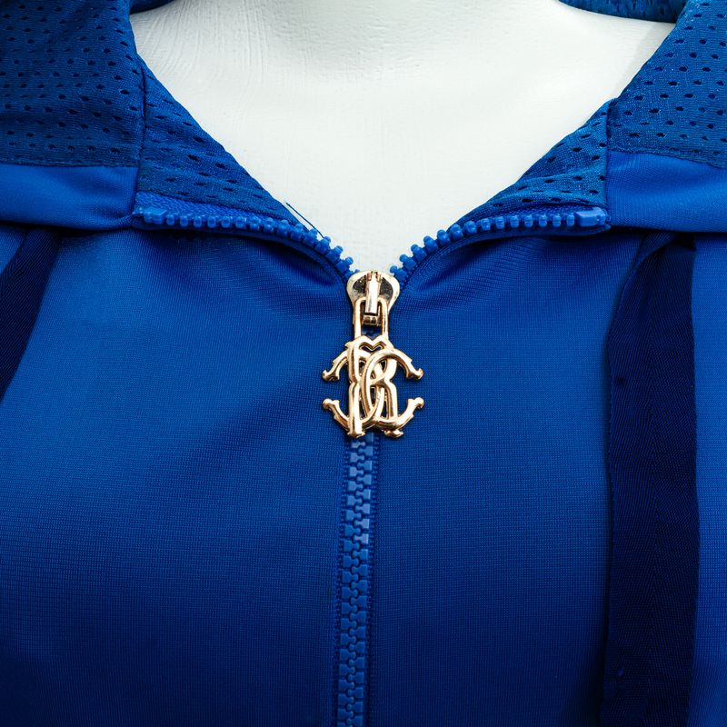 Conjunto da marca Roberto Cavalli, linha gym, composto por calça e casaco. Confeccionado em poliéster com algodão na cor azul, bordados em amarelo e dourado. Calça com ajuste na cintura e elástico na cintura e nos pés, e casaco com capuz, fecho por zíper e elástico na barra e nos punhos. A peça se encontra em estado satisfatório, com algumas marcas de uso aparentes ao longo do tecido, e marca de caneta na perna direita.