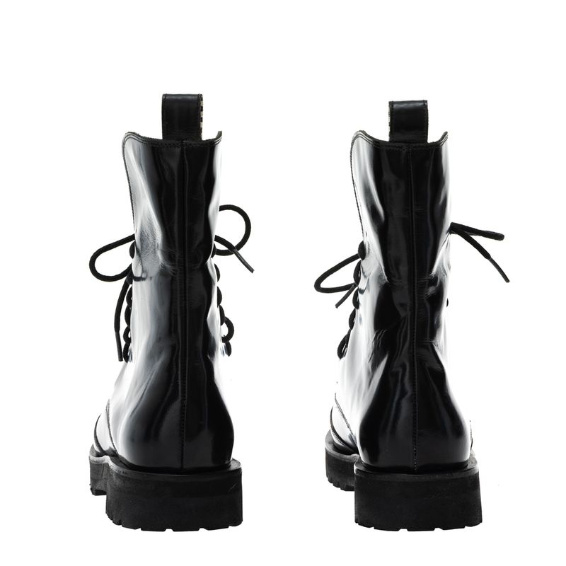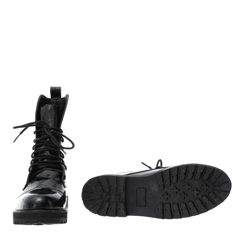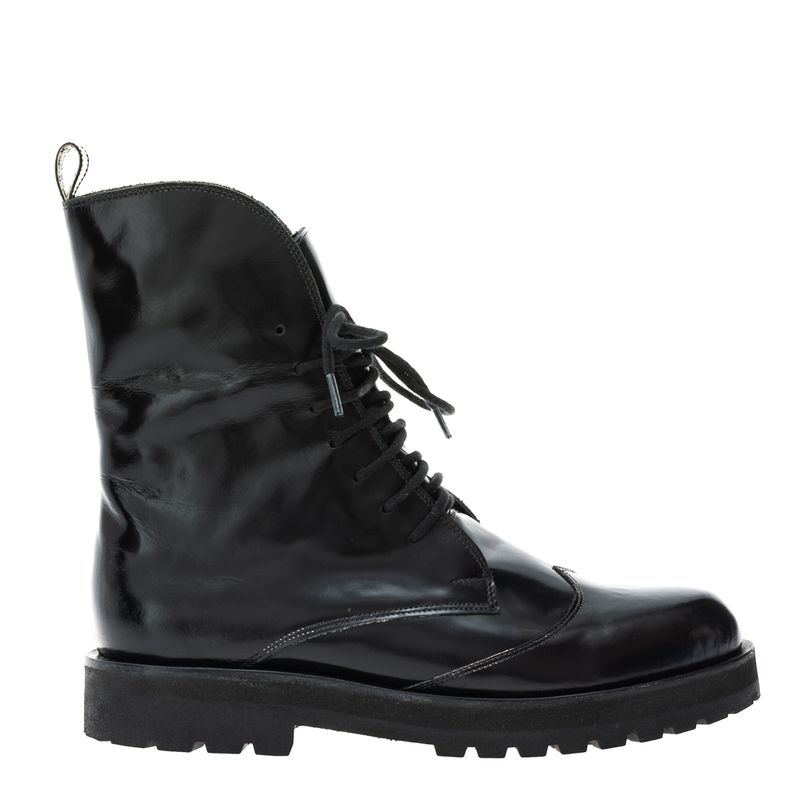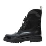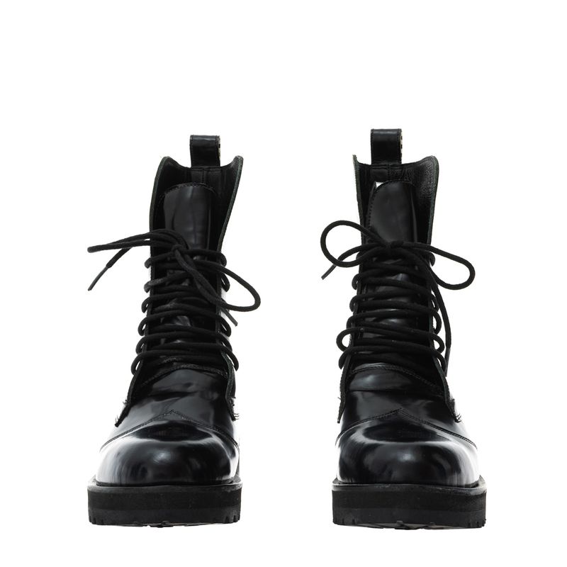 Coturno da marca Manolita. Confeccionado em couro preto, bico arredondado, cano médio, solado emborrachado e fechamento por cadarço. A peça se encontra em excelente estado, muito bem conservada.