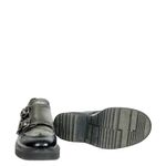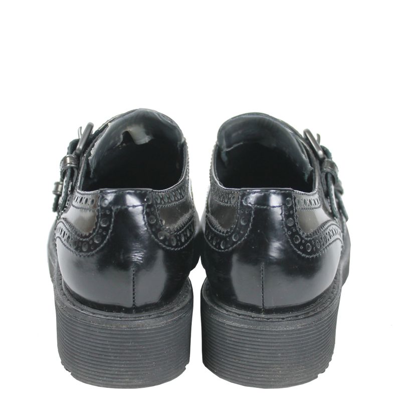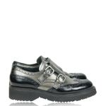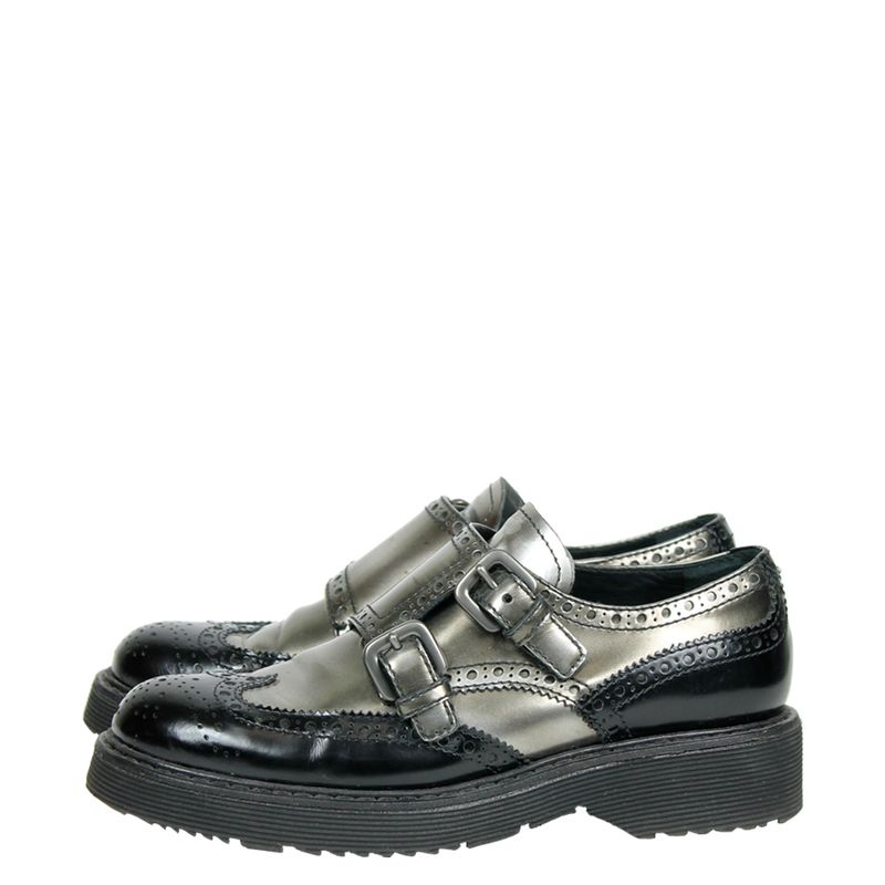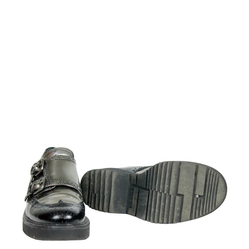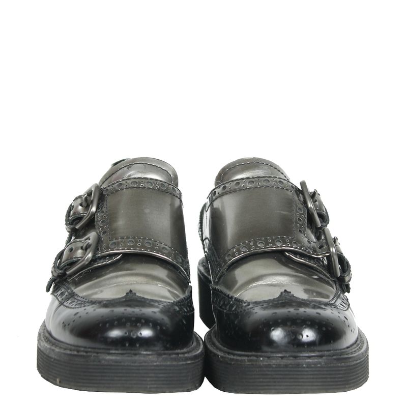Creeper da marca Prada, tamanho 36 1/2 sola, aproximadamente 34-35, confeccionado em couro preto e cor de chumbo fosco. O sapato encontra-se em ótimo estado de conservação, com sinais de uso e sola levemente gasta.
