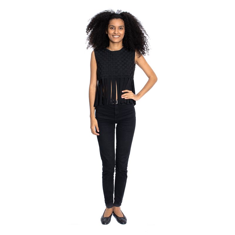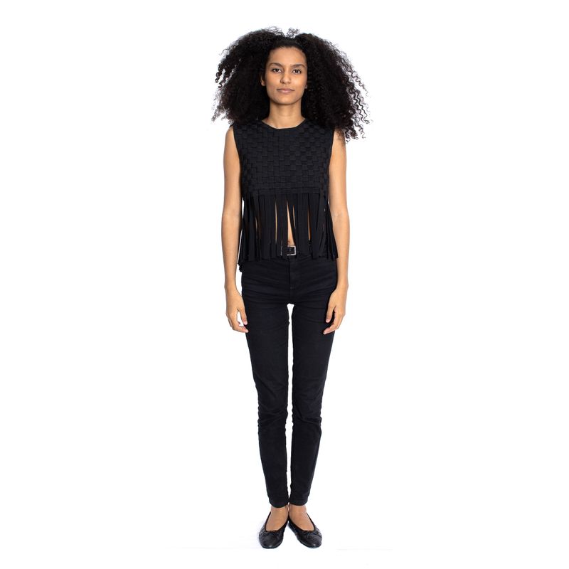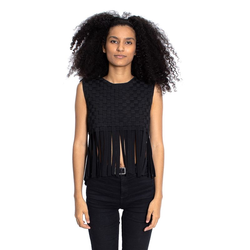 Cropped da marca Lolitta, tamanho G. Confeccionado em bandagem trançada na cor preta, detalhes com franjas. Encontra-se em bom estado de conservação.