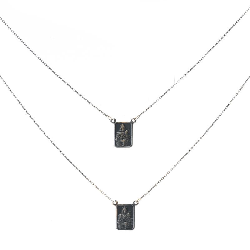 Escapulário Pequeno, tamanho 66 cm comprimento. Confeccionado em ouro negro, com as imagens do escapulário são do Sagrado Coração de Jesus e de Nossa Senhora. Encontra-se em ótimo estado de conservação.