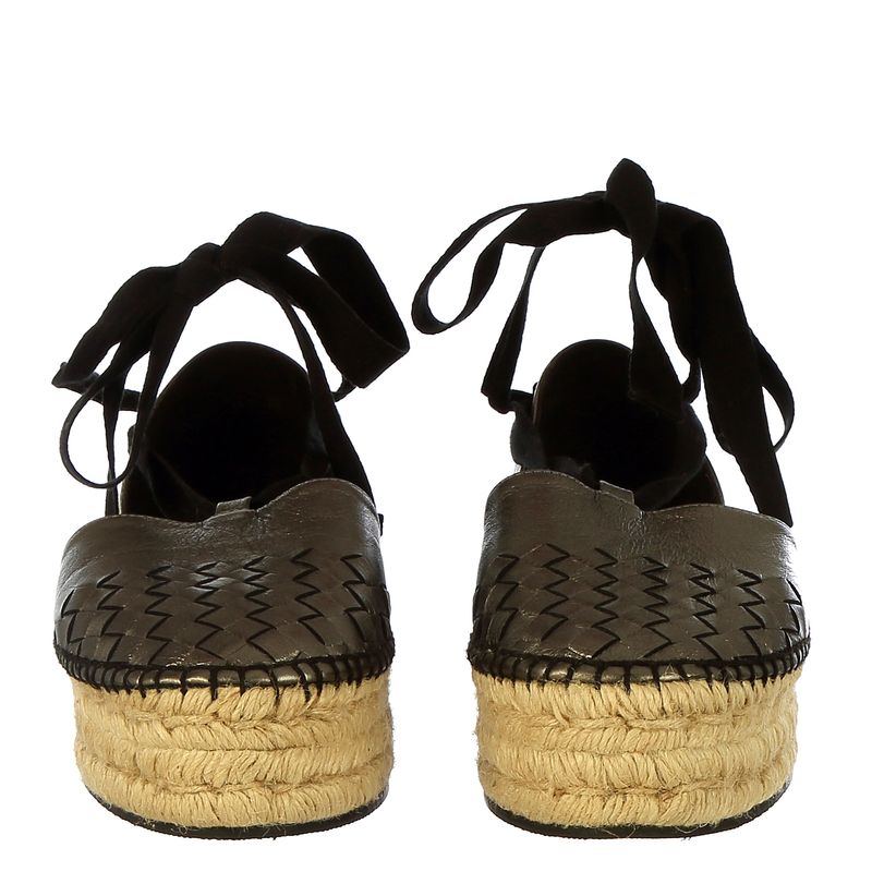 Espadrille da marca Bottega Veneta. Confeccionada em couro metalizado e ráfia, a peça possui fecho por meio de amarração. A peça se encontra em excelente estado, muito bem conservada.
