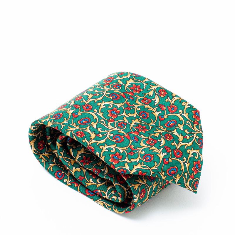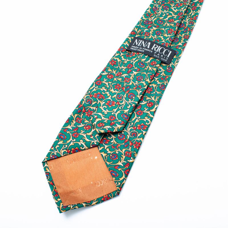 Gravata da marca Nina Ricci, confeccionada em seda verde estampada. Encontra-se em ótimo estado de conservação. Medidas: 144cm de comprimento, 4cm de pé menor e 8cm de pé maior.