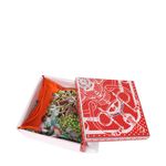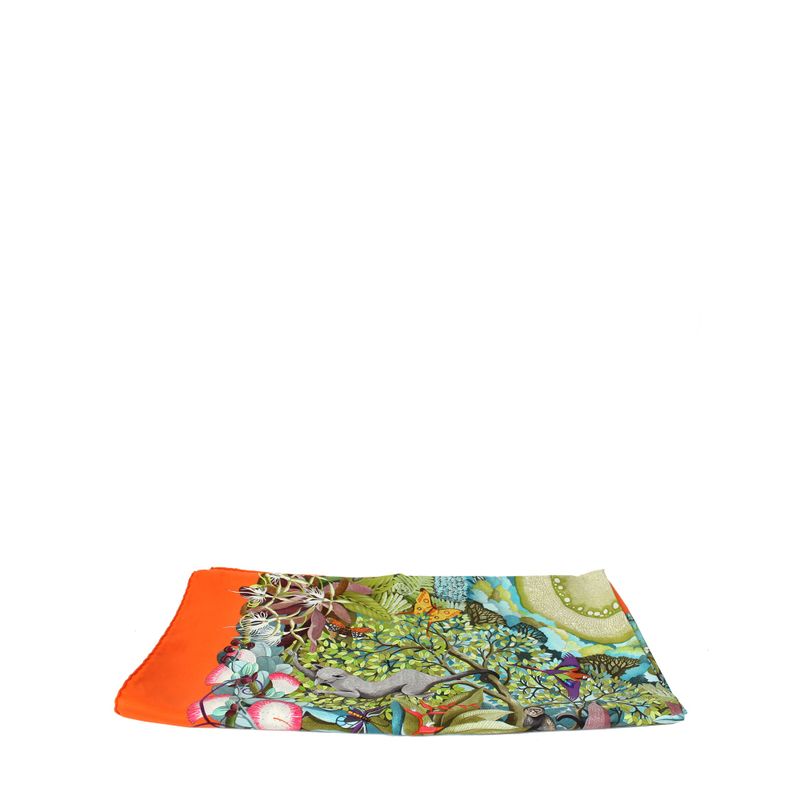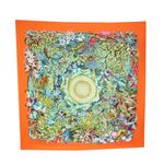 Lenço da marca Hermes, tamanho 90cmx90cm, confeccionado em seda com estampa colorida e borda laranja. O lenço conta com acabamento feito a mão. Encontra-se em excelente estado de conservação, sem marcas de uso.