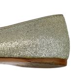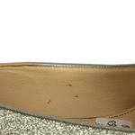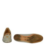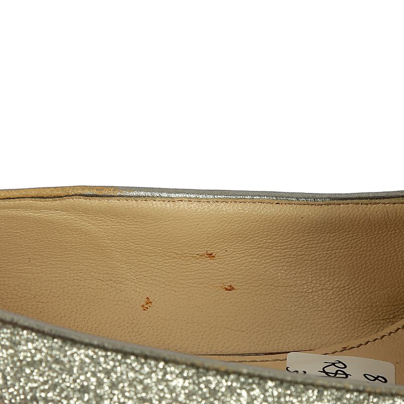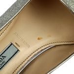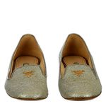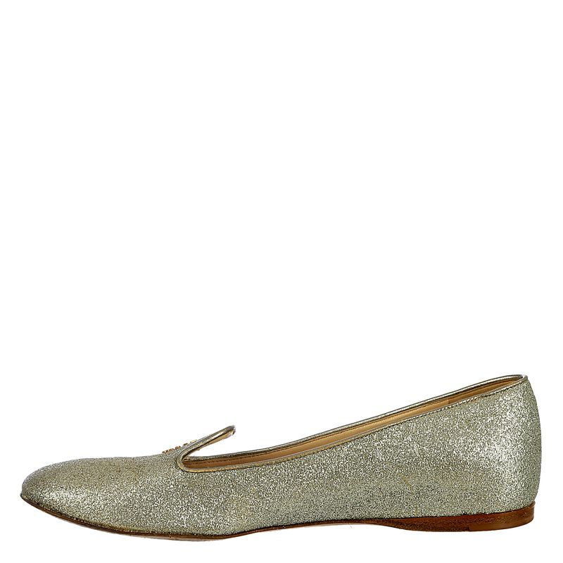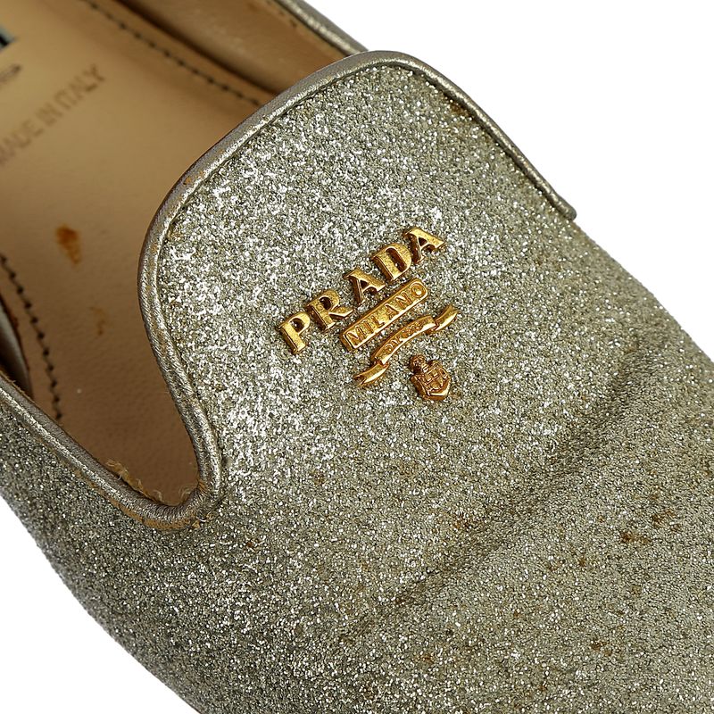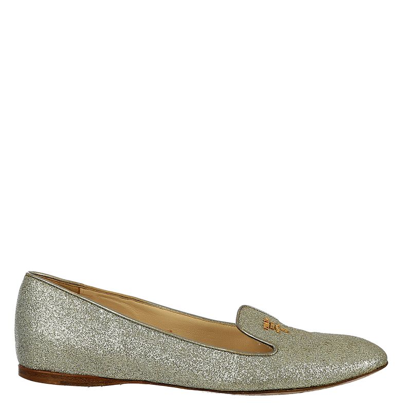 Loafer da marca Prada. Confeccionado em couro e glitter na cor prateada. Possui detalhe frontal com logo em metal dourado. A peça contém marcas de uso expressivas, manchas e/ou danos.