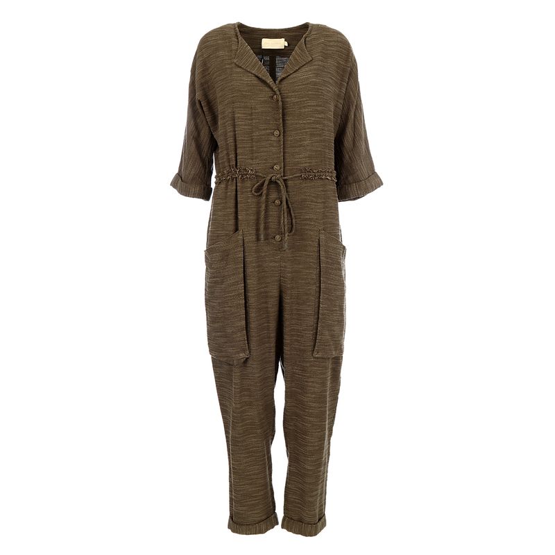 Macacão da marca Cris Barros. Confeccionado em tecido rústico na cor verde militar. O modelo possui fecho de botões na parte da frente, ajuste de corda na cintura e bolsos na parte da frente e de trás. A peça se encontra em ótimo estado, com levíssimas marcas de uso.