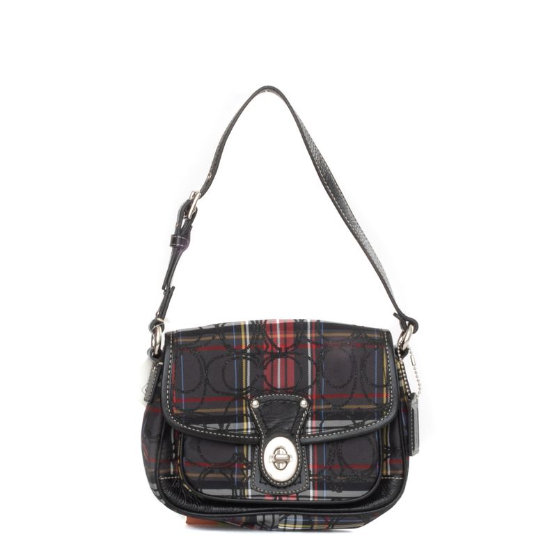 Mini Bolsa da marca Coach, tamanho 15 cm C x 10 cm A. Confeccionado lona na cor preta estampada , com ferragens em metal prateado e acabamento em couro preto. A bolsa possui uma alça de mão, dois compartimentos, dois bolsos internos e fechamento botão giratório. Encontra-se em perfeito estado de conservação.