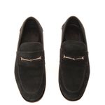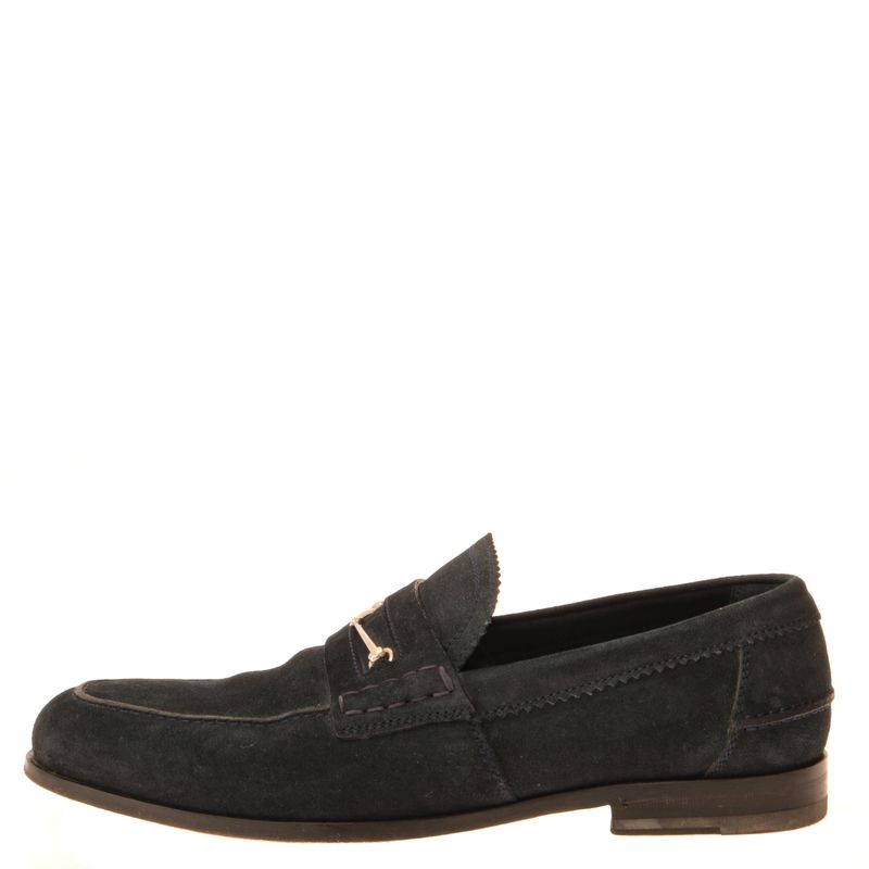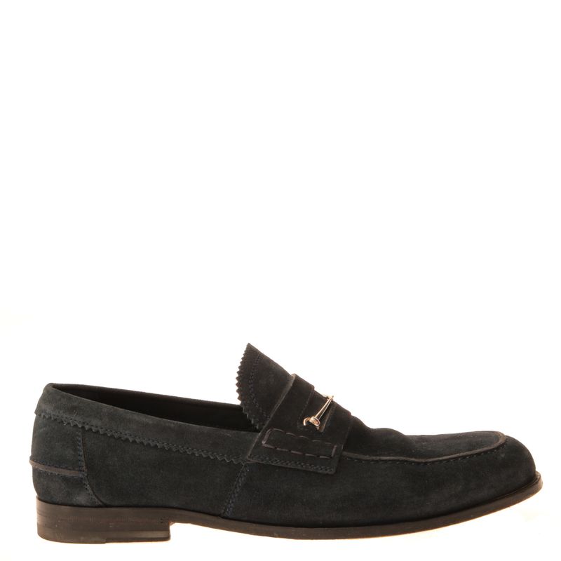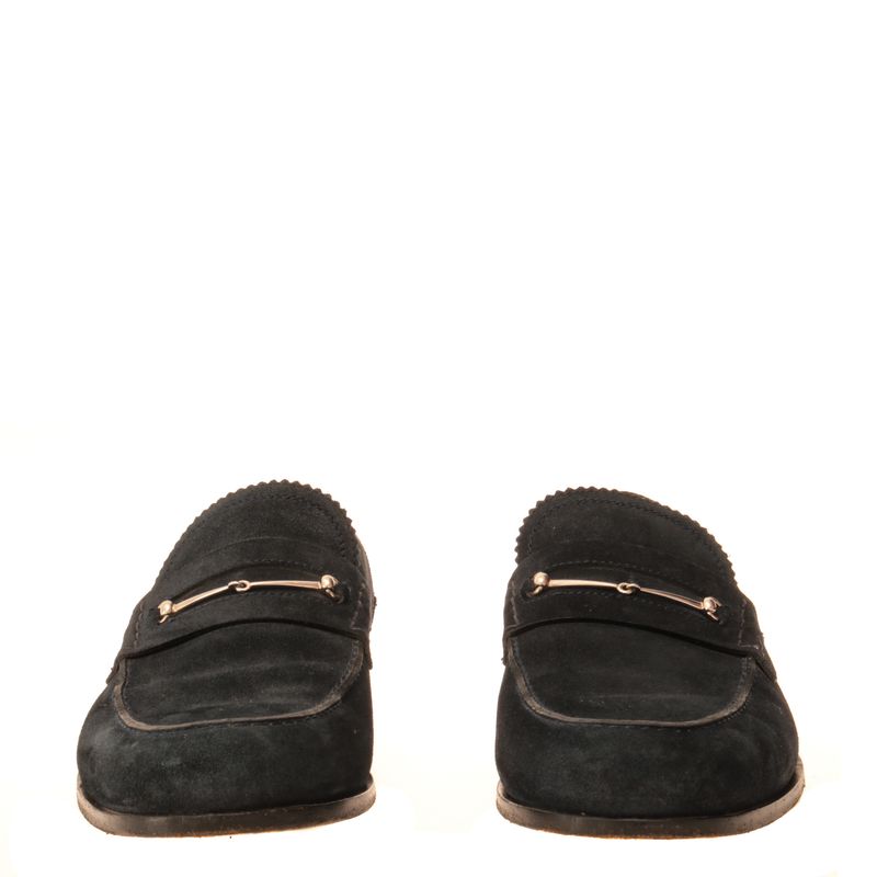 Mocassim da marca Gucci. Confeccionado em carmurça na cor azul marinho, com detalhe de horebit em metal prateado. A peça se encontra em ótimo estado, com leves marcas de uso.