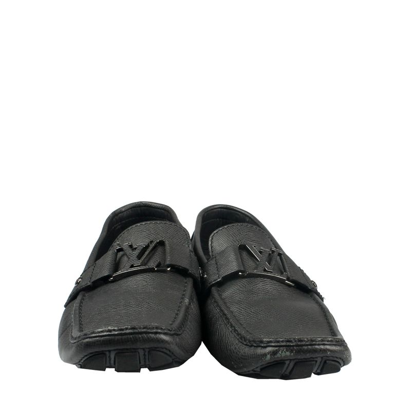 Mocassim da marca Louis Vuitton tamanho 9 sola, aproximadamente 41/42 Brasil, confeccionado em couro cinza escuro. Conta com detalhe com o monograma da marca em metal prateado e couro. A sola é emborrachada. Se encontra em bom estado de conservação, com levíssimos desgastes ao redor próximo a sola.