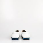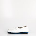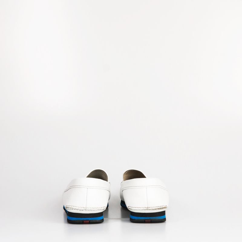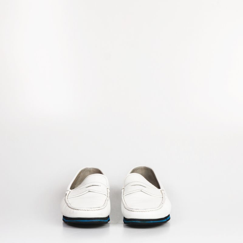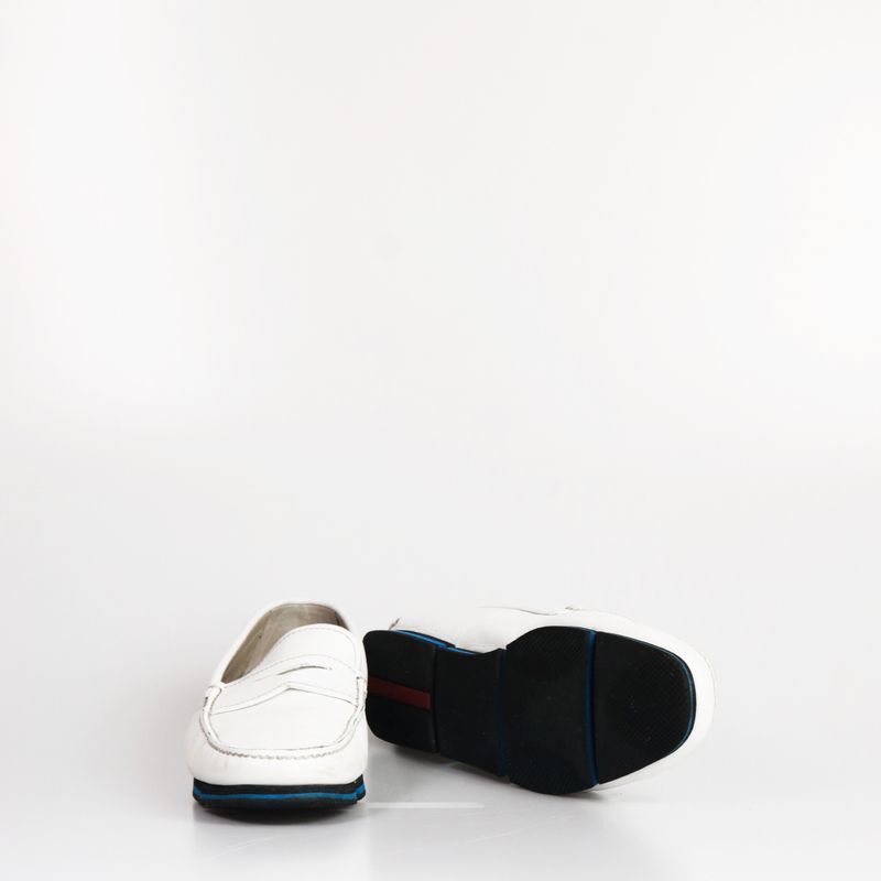 Sapato mocassim da marca Prada, tamanho 8 sola, aproximadamente 38-39 BR, confeccionado em couro branco, com sola preto e azul. Encontra-se em bom estado de conservação.