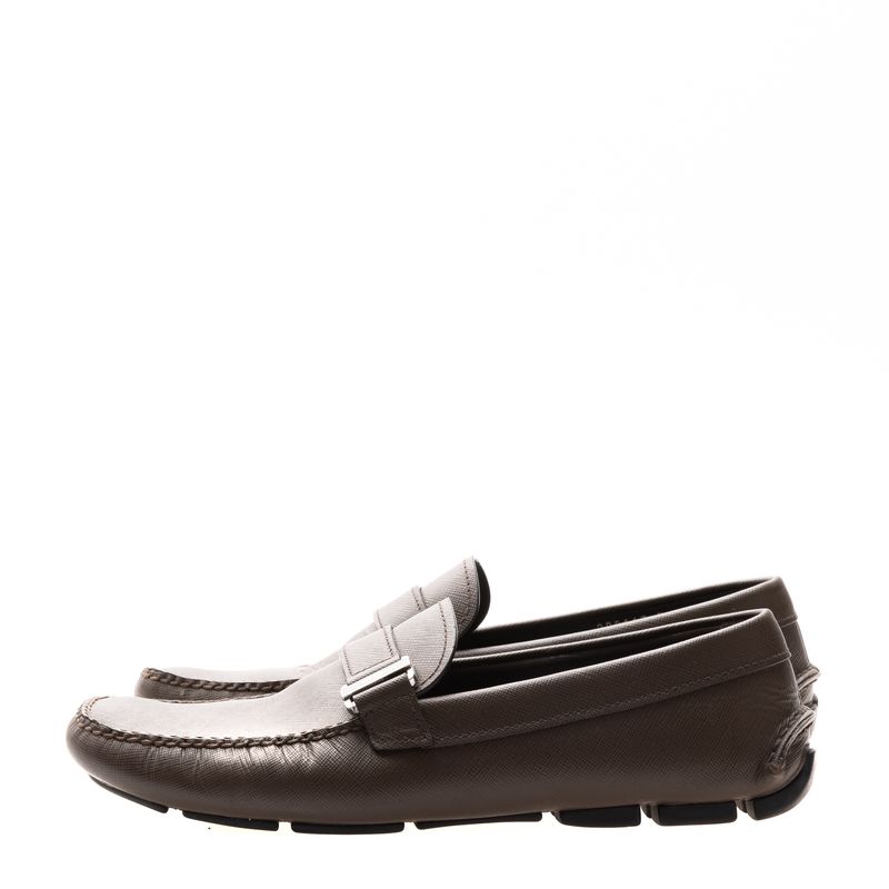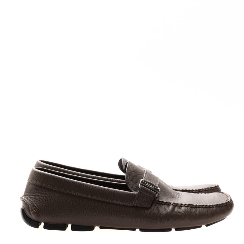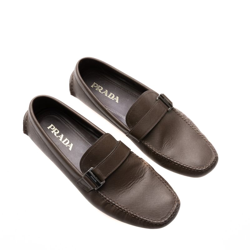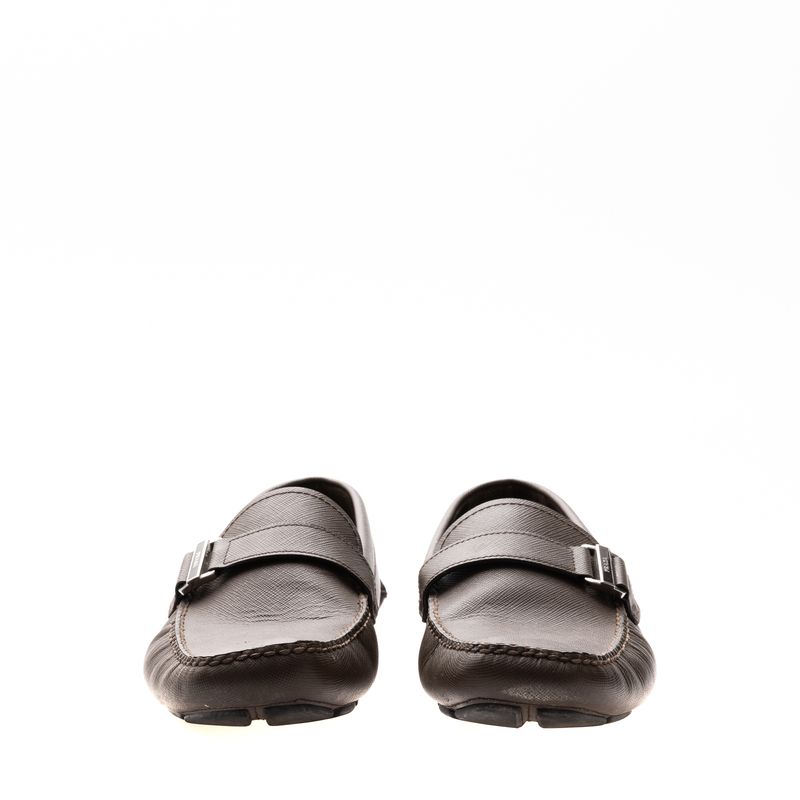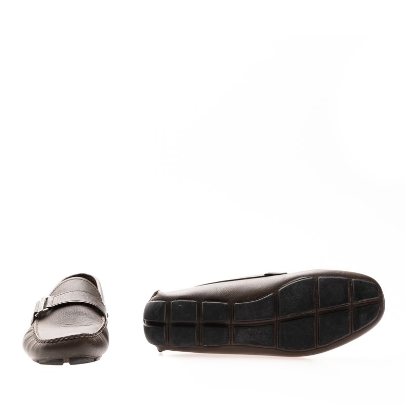 Mocassim da marca Prada, tamanho 7 1/2 sola aproximadamente 39 Brasil. Confeccionado em couro saffiano na cor marrom, com fivela com nome da marca. A peça apresenta marcas de uso e desgastes.