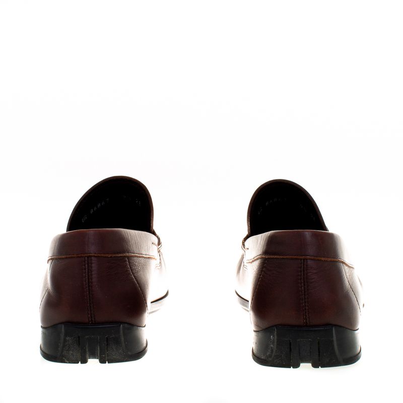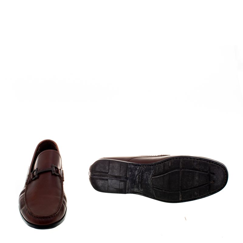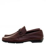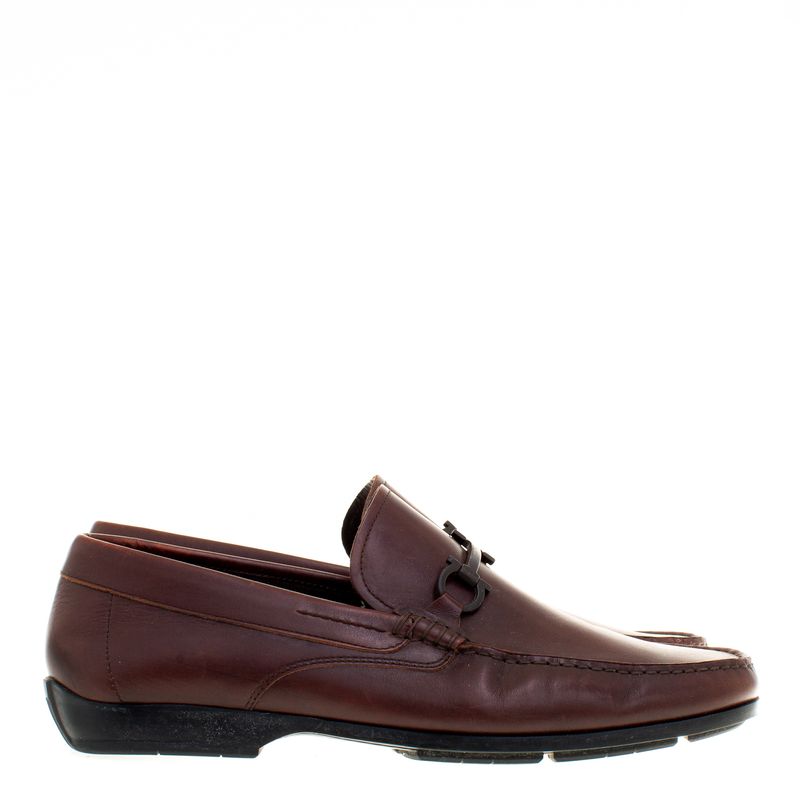 Mocassim da marca Salvatore Ferragamo, tamanho 9 1/2 sola, aproximadamente 41/42 Brasil. Confeccionado em couro na cor marrom, com detalhes na parte da frente com fivelas. Encontra-se excelente estado de conservação.