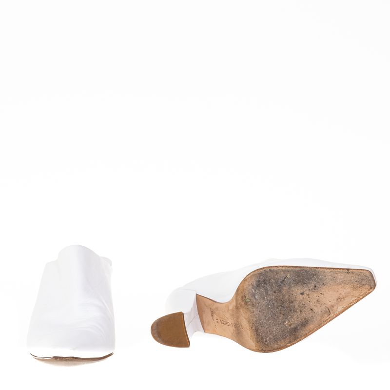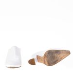 Sapato estilo mule da marca Bottega Veneta. Confeccionado em couro de cordeiro na cor branca, forro em couro nappa e solado em couro. Modelo mule com salto alto largo, estilo slip-on, solado com logo e bico arredondado. A peça se encontra em ótimo estado, com levíssimas marcas de uso, estando com alguns desgastes no bico e no solado, um desgaste no salto e uma manchinha na lateral do pé esquerdo.