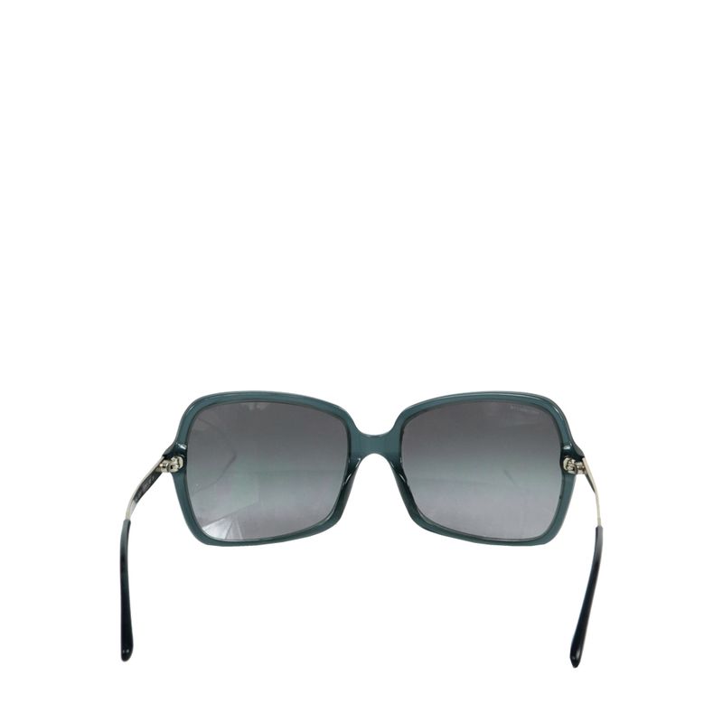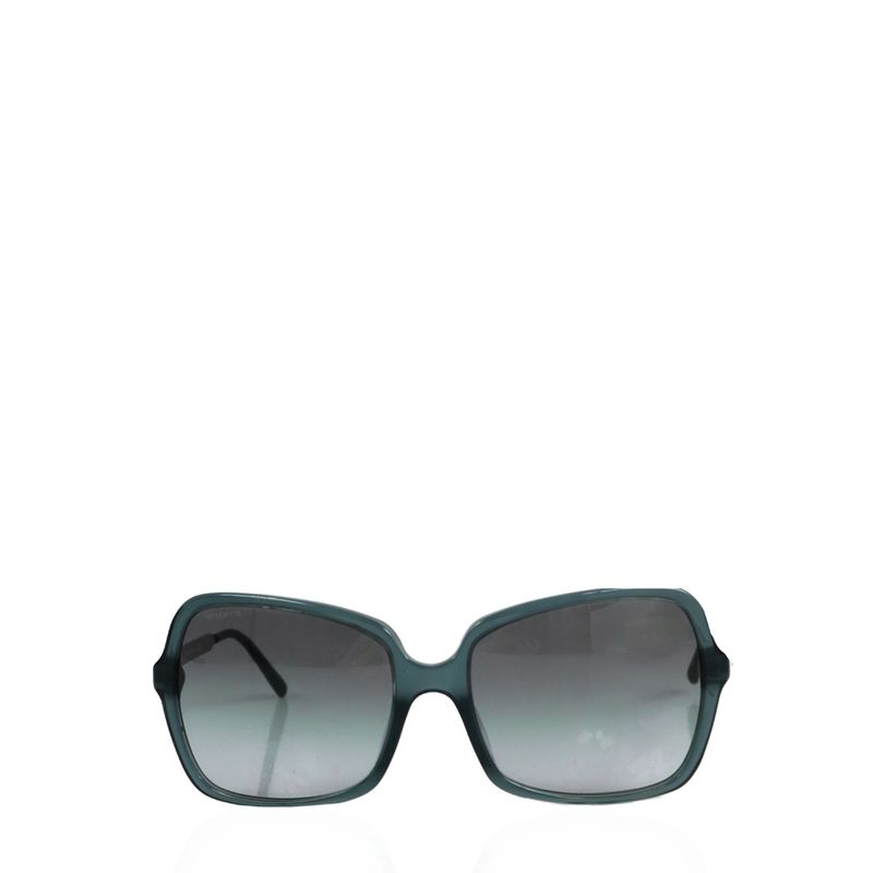 Óculos da marca Burberry, tamanho 14,5 cm de comprimento X 5,5 cm de altura, confeccionado em acetato chumbo com laterais em metal prateado e lentes cinza. Encontra-se em ótimo estado de conservação, com leve arranhão na lente.