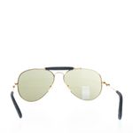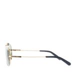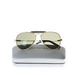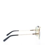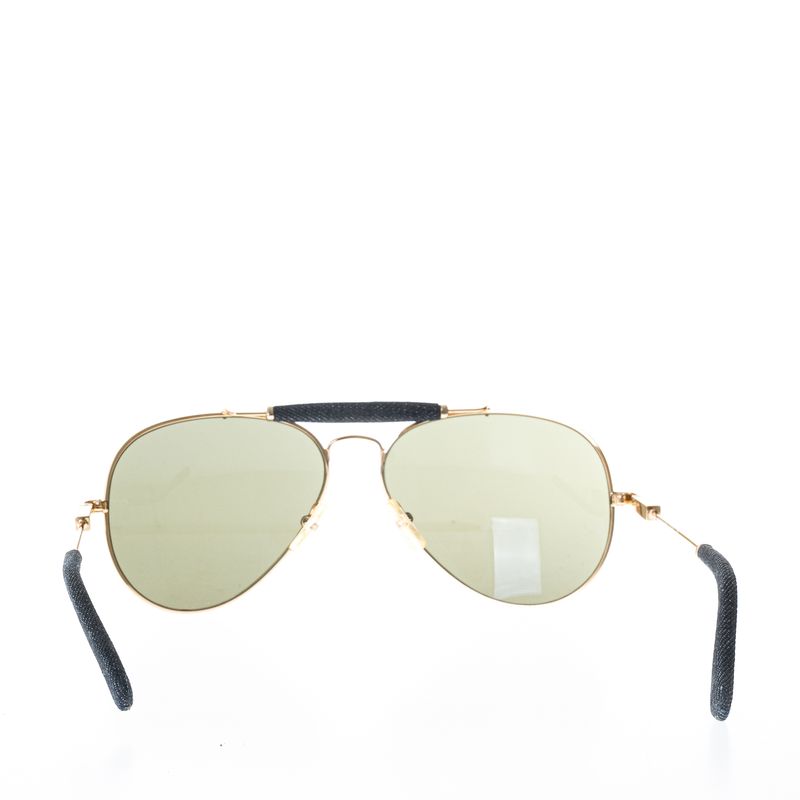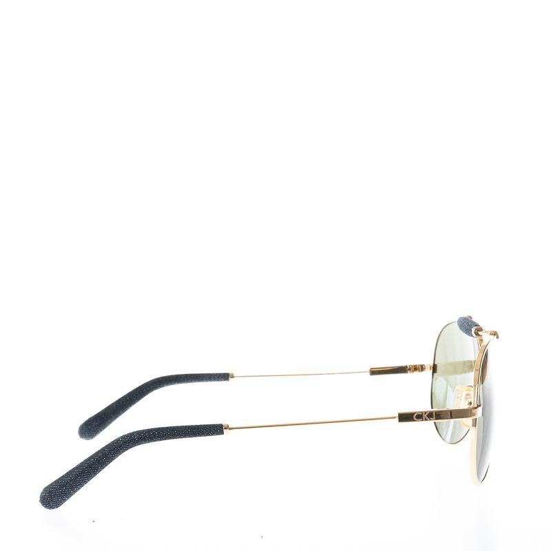 Óculos da marca Calvin Klein, tamanho 13,5 cm C x 5 cm A. Confeccionado em metal dourado, modelo aviador e detalhe em tecido jeans. A peça se encontra em estado satisfatório, com leves marcas de uso.