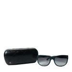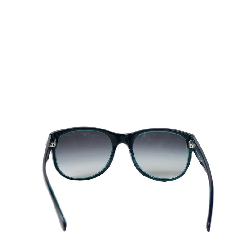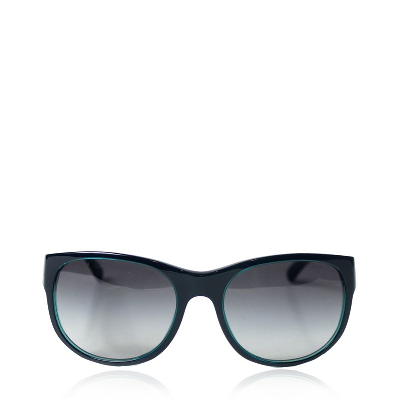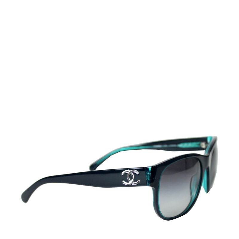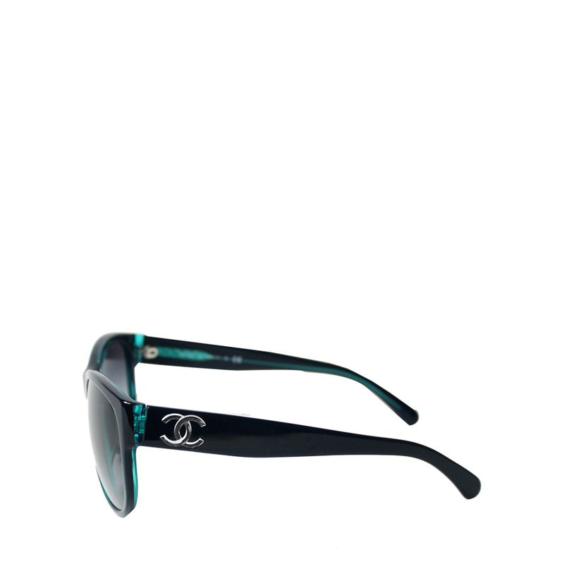 Óculos da marca Chanel, tamanho 14 cm L x 5 cm A, confeccionado em acetato azul com as lentes degradê pretas. Encontra-se em excelente estado de conservação, sem marcas de uso.