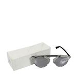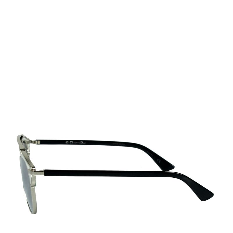 Óculos da marca Christian Dior, tamanho 14 cm C x 5 cm A, com armação em metal prateado, hastes em acetato preto e lentes espelhadas prateadas. Encontra-se em excelente estado de conservação, sem marcas de uso.