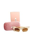 Oculos da marca Miu Miu, tamanho 15,5cm C x 4cm A, confeccionado com metal dourado. O modelo acompanha caixa. Se encontra em perfeito estado de conservaçao