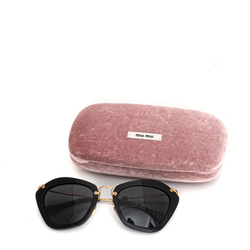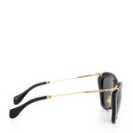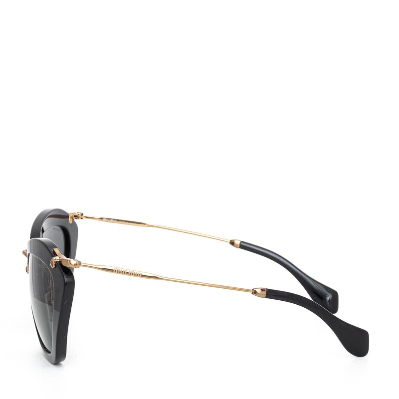 Óculos da marca Miu Miu, tamanho 15 cm C x 5,5 cm A, confeccionado em acetato preto com as hastes em metal dourado e acetato preto. O óculos encontra-se em excelente estado de conservação, com levíssimas marcas de uso.