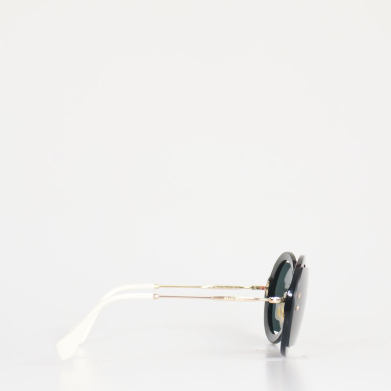 Óculos da marca Miu Miu, tamanho 14 cm L x 6 cm A, confeccionado em acetato preto, metal dourado e ponteiras em acetato branco. Encontra-se em excelente estado de conservação, sem sinais de uso.
