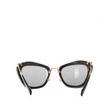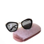 Óculos da marca Miu Miu, tamanho 15 cm C x 5,5 cm A. Confeccionado em acetato preto, com hastes em metal dourado e lentes pretas. A peça se encontra em bom estado, com leves marcas de uso nas lentes.