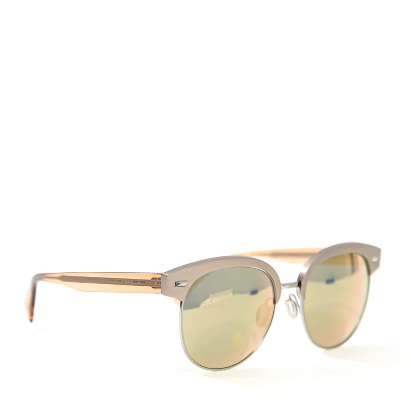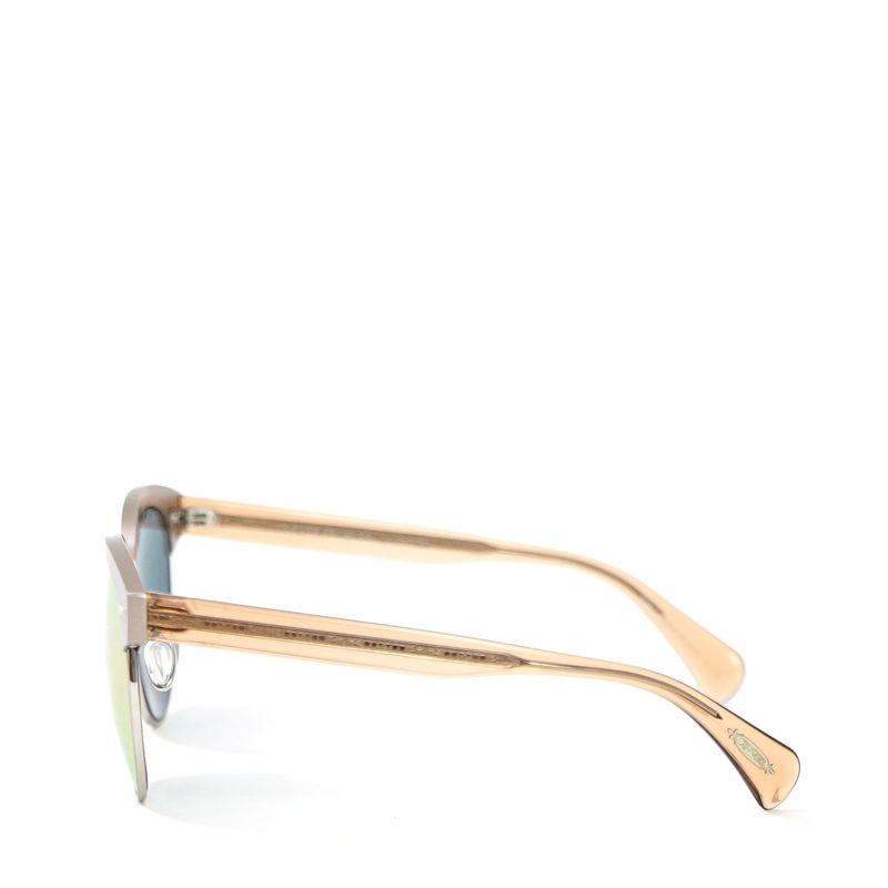 Óculos da marca Oliver Peoples, tamanho 15 cm C x 5 cm A, confeccionado em metal rosé, hastes em acetato e lentes espelhadas dourada. Encontra-se em excelente estado de conservação.