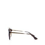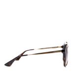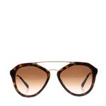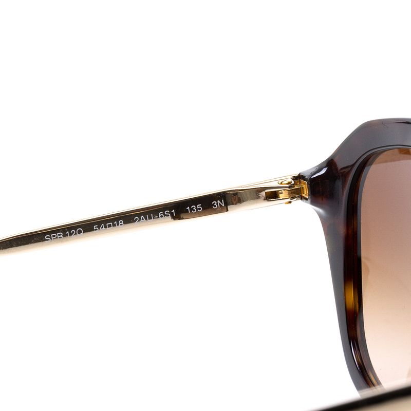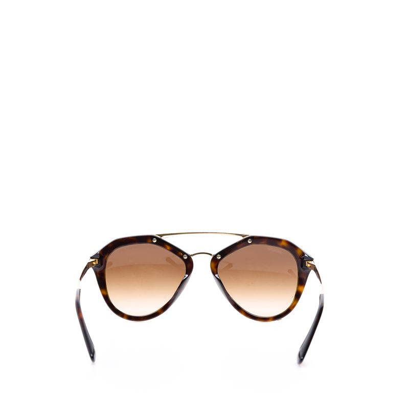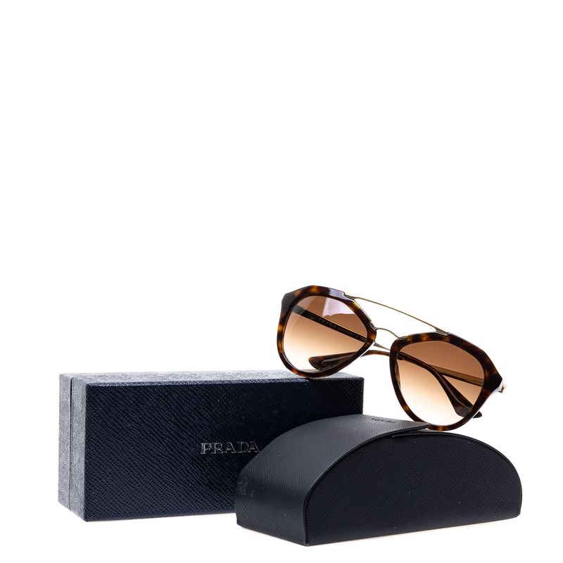 Óculos da marca Prada SPR 12Q. Confeccionado em acetato marrom mesclado, detalhe e hastes em metal dourado, lentes marrons. Possui tamanho 14 cm C x 5,5 cm A. A peça se encontra em ótimo estado, com levíssimas marcas de uso.
