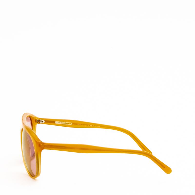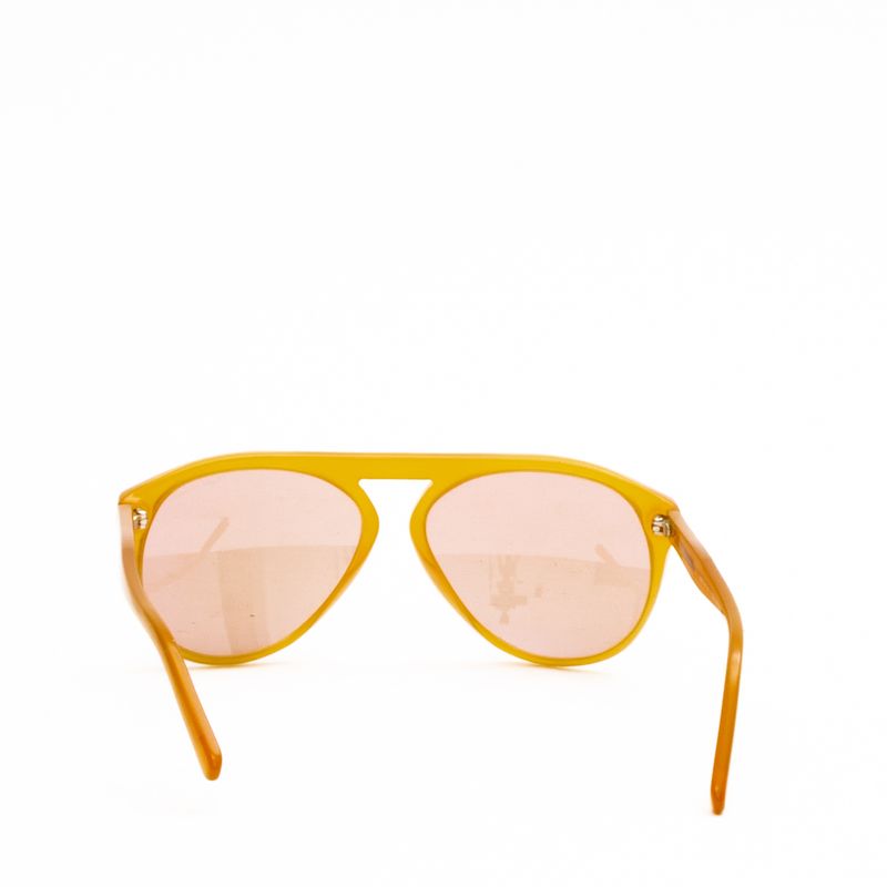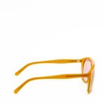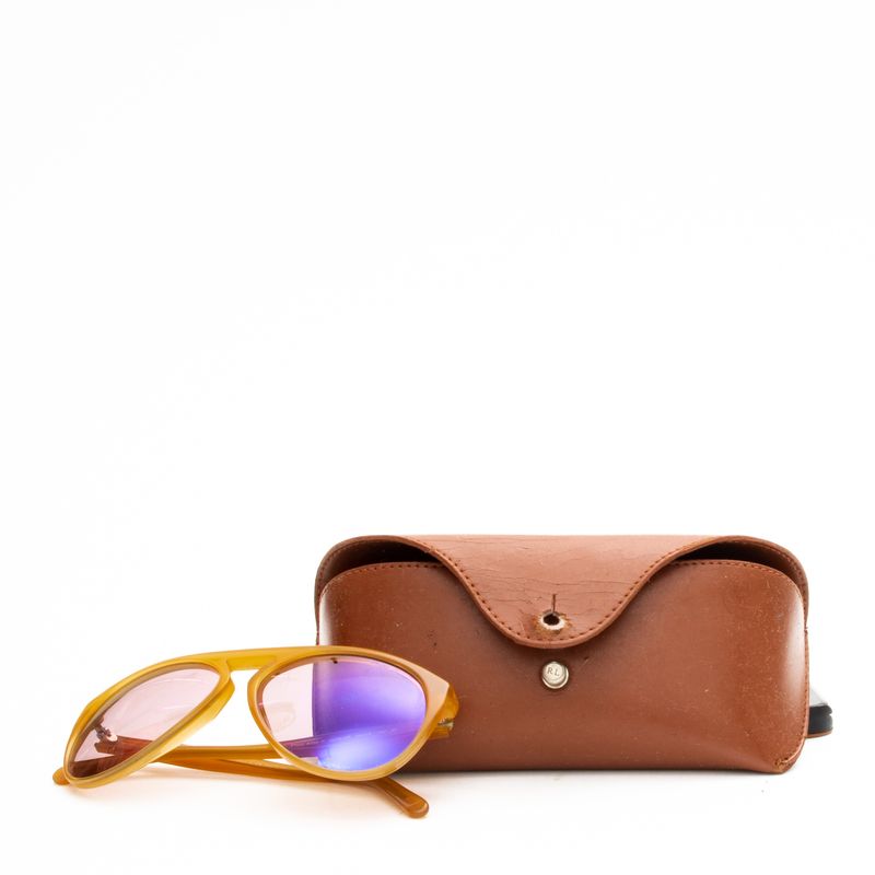 Óculos da marca Ralph Lauren, tamanho 14 cm C x 5 cm A. Confeccionado em acetato na cor caramelo, com lentes roxa levemente espelhada. Encontra-se em ótimo estado de conservação, com desgaste no estojo.