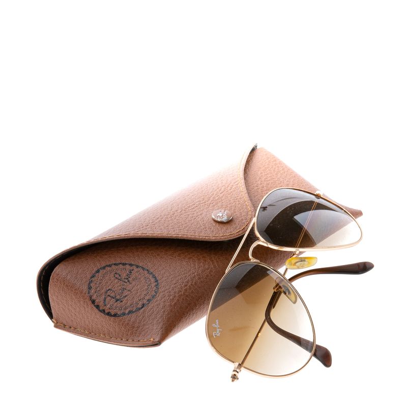 Óculos da marca Ray Ban, tamanho 13 cm C x 5 cm A. Confeccionado em metal dourado, lentes marrons. Encontra-se em bom estado de conservação, com levíssiomos risquinhos e desgastes no metal.
