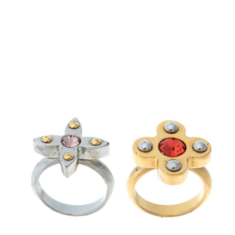 Par Anéis da marca Louis Vuitton Flor. Confeccionado em metal dourado e prateado, no formato dos símbolos da LV, com cristais rosas. A peça se encontra em ótimo estado, com leves marcas de uso.