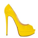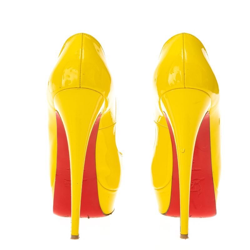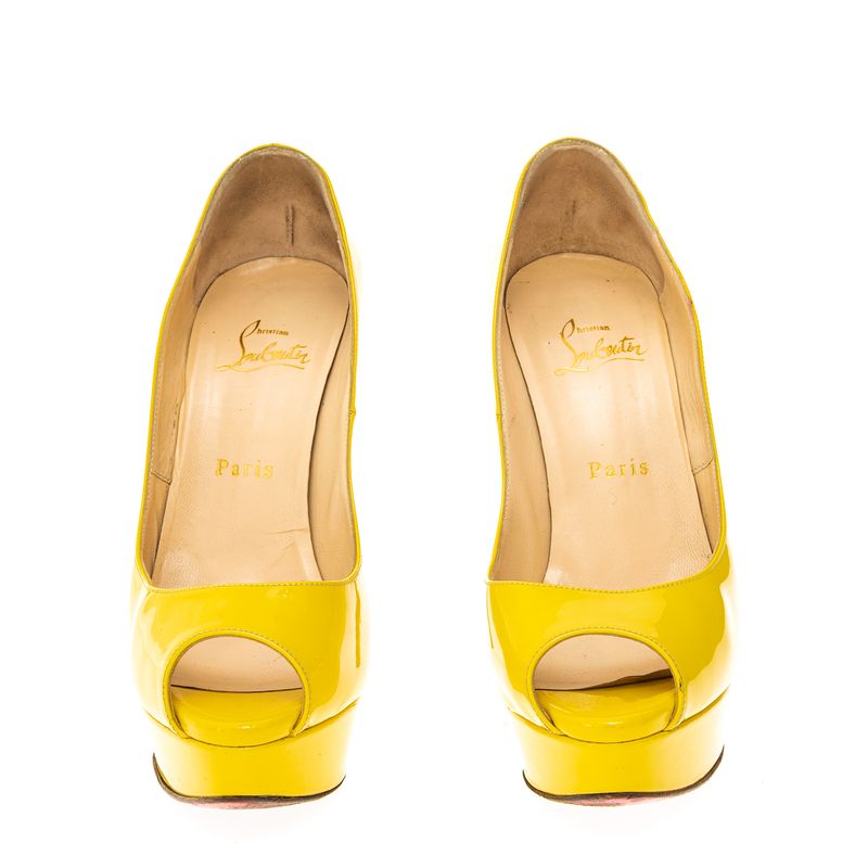 Peep Toe da marca Christian Louboutin. Confeccionado em verniz na cor amarela. A peça se encontra em estado satisfatório, com leves marcas de uso aparentes, com manchas de uso e pequena descoloração no exterior (conforme foto).