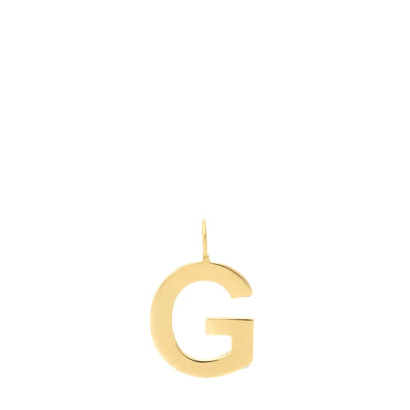 Pingente G, confeccionado em ouro dourado. A peça se encontra em ótimo estado, com leves marcas de uso, riquinhos.