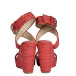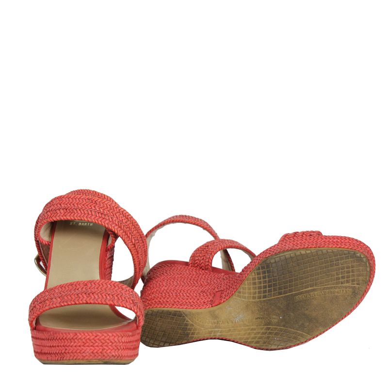 Plataforma da marca Stuart Weitzman tamanho 38 1/2 sola (37 BR). Confeccionada em couro trançado laranja/coral. O fecho é por meio de fivela em metal dourado. Possui salto alto de altura 12cm e meia pata de 3cm. Se encontra em ótimo estado de conservação.