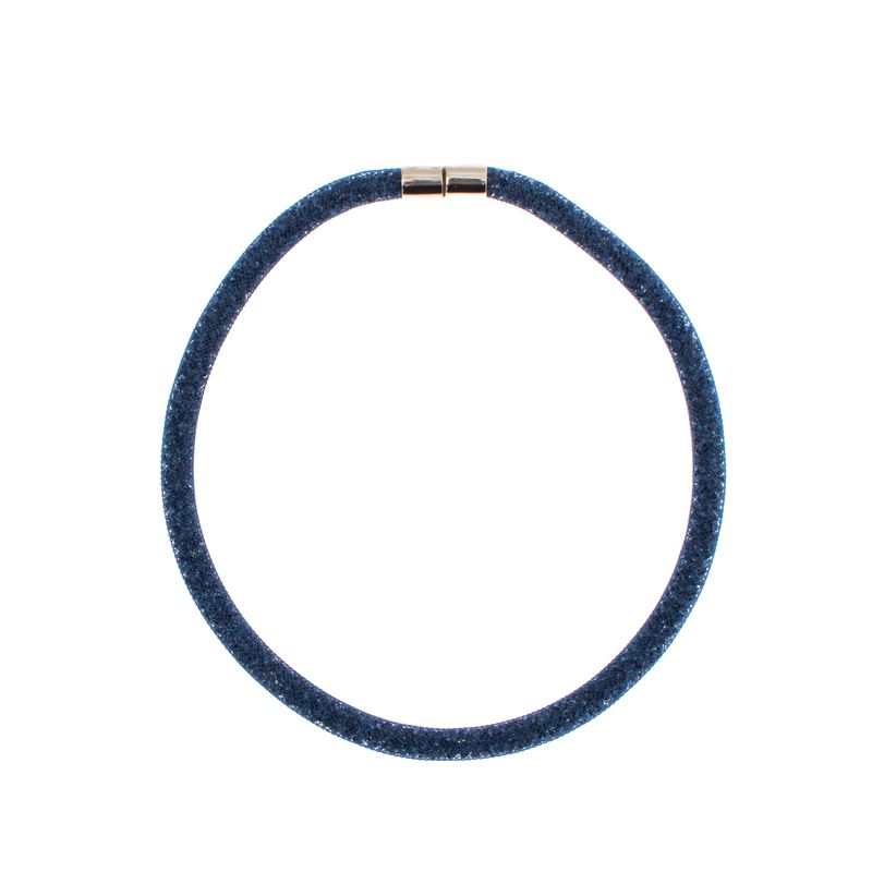 Pulseira Swarovski, modelo Stardust. Confeccionado em tela de nylon azul marinho, com cristais da mesma cor, fecho magnético em metal prateado. A peça se encontra em excelente estado, muito bem conservada.
