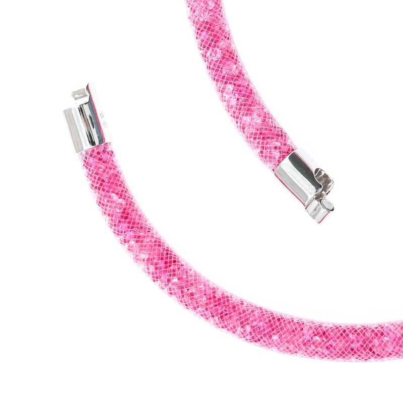 Pulseira da marca Swarovski, modelo Stardust. Confeccionado em tela plástica transparente, preenchido com mini cristais na cor rosa, fecho por encaixe magnético. Pode ser usado como gargantilha ou como pulseira de 2 voltas. A peça se encontra em excelente estado, muito bem conservada. Medida: 39cm