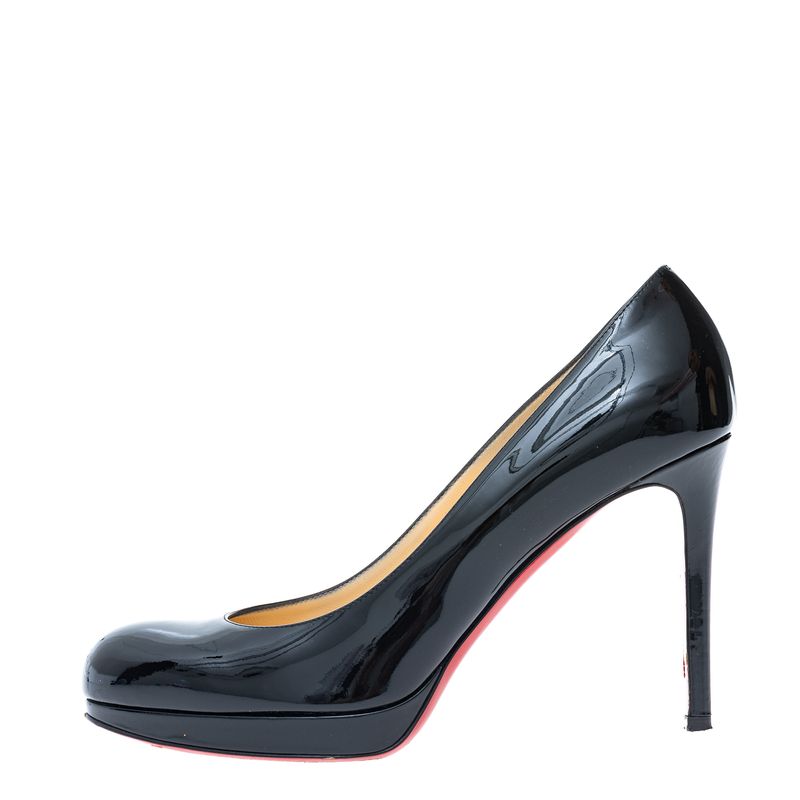 Sapato com pump da marca Christian Louboutin. Confeccionado em verniz na cor preta e sola vermelha. Modelo com salto fino, bico redondo e pump na parte da frente. A peça se encontra em ótimo estado, com levíssimas marcas de uso.