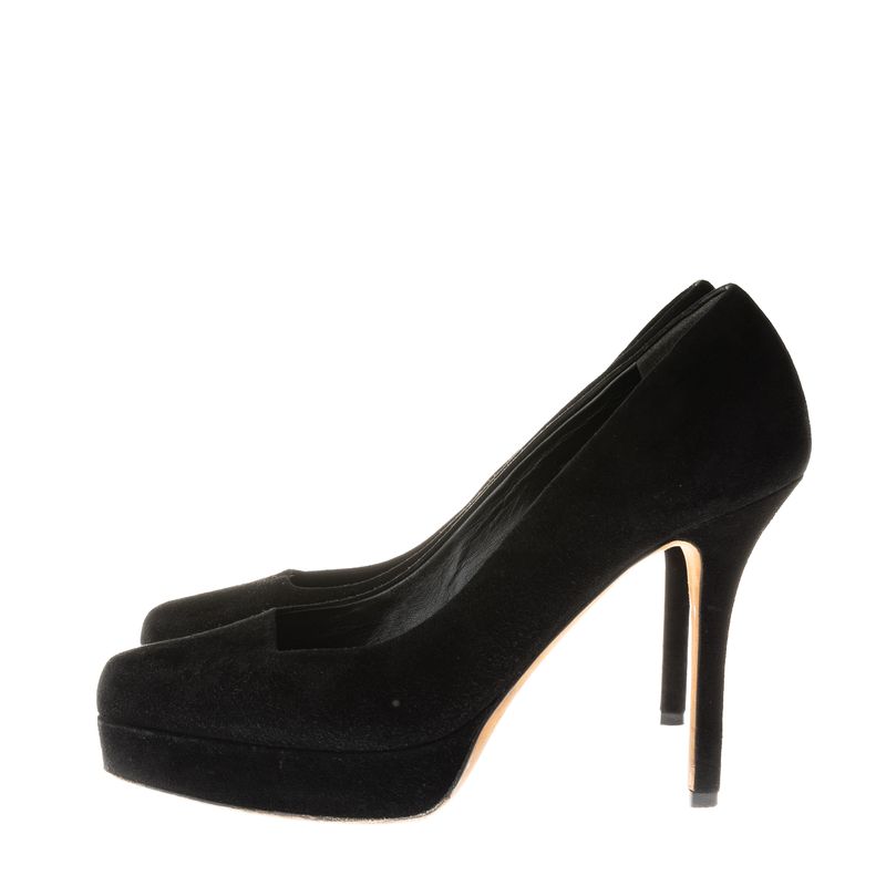 Sapato da marca Gucci. Confeccionado em camurça na cor preta. A peça possui pump, bico quadrado e salto fino. A peça se encontra em estado satisfatório, com marcas de uso e desgastes aparentes ao longo da camurça e no solado. O salto possui alguns desgastes.