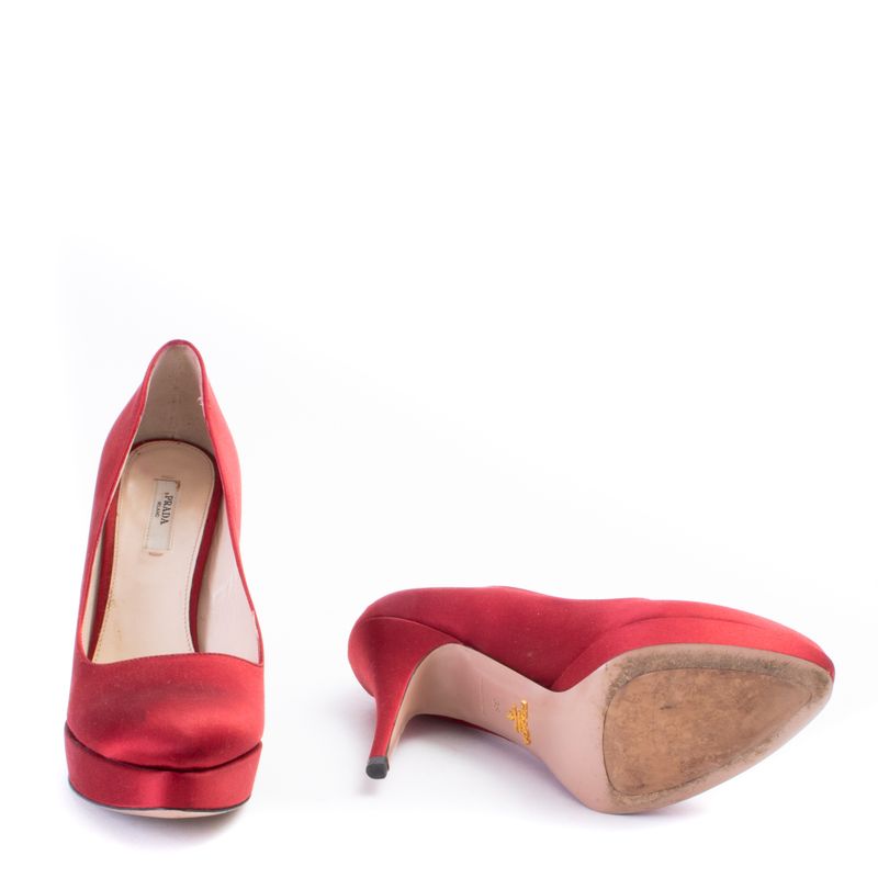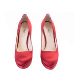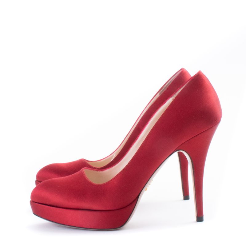 Pump da marca Prada, tamanho 38 sola, aproximadamente 36 Brasil. Confeccionado em cetim na cor vermelha. Contém salto 12 cm de altura e 2 cm meia pata. Encontra-se em ótimo estado de conservação, com leves desgastes. Comprimento da sola: 24 cm.