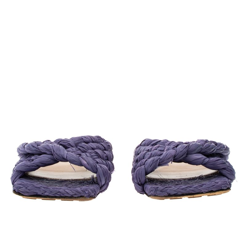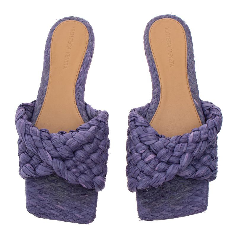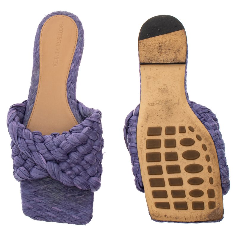 Rasteira Bottega Veneta Intrecciato, confeccionado em ráfia lilás, solado de couro. A peça se encontra em ótimo estado, com leves marcas de uso nos bicos e solas.