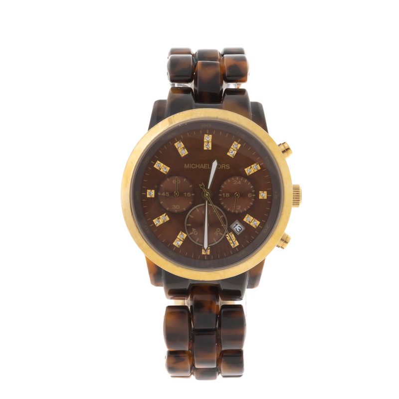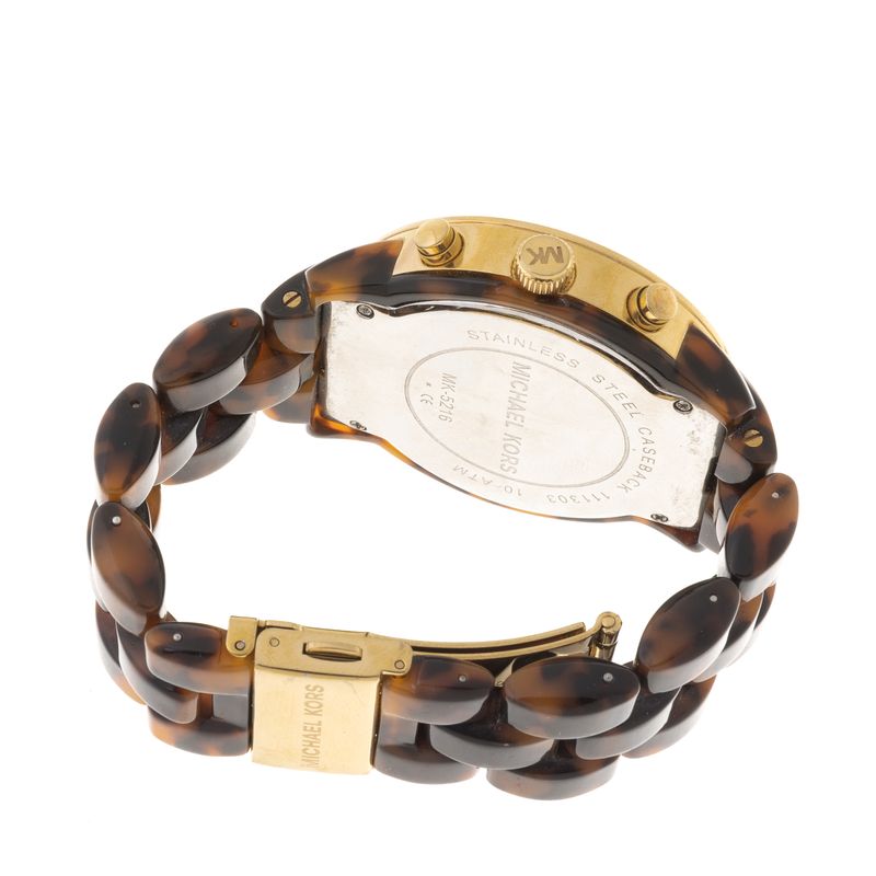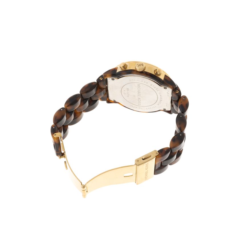 Relógio da marca Michael Kors, modelo MK-5226. Confeccionado em acetato marrom rajado, ferragens metais dourado. Tamanho: 4,3cm de diâmetro. A peça se encontra em ótimo estado, com levíssimas marcas de uso.